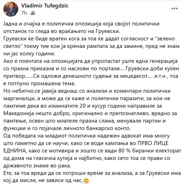 Познатиот скопски адвокат Владимир Туфегџиќ предизвика бурни реакции на социјалните мрежи, откако преку Фејсбук објава жестоко ја критикуваше македонската опозиција. Во својот пост, тој директно укажува дека темата за наводното враќање на Никола Груевски после поразот на Виктор Орбан на изборите во Унгарија се користи како политичка стратегија без реална основа.