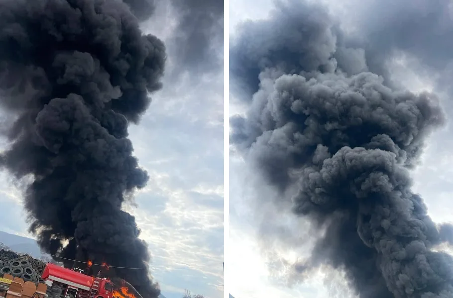 Црн чад се издига од пожарот која зафатил поголема количина автомобилски гуми во Тетовско. Тетовските пожарникари се борат со пожар