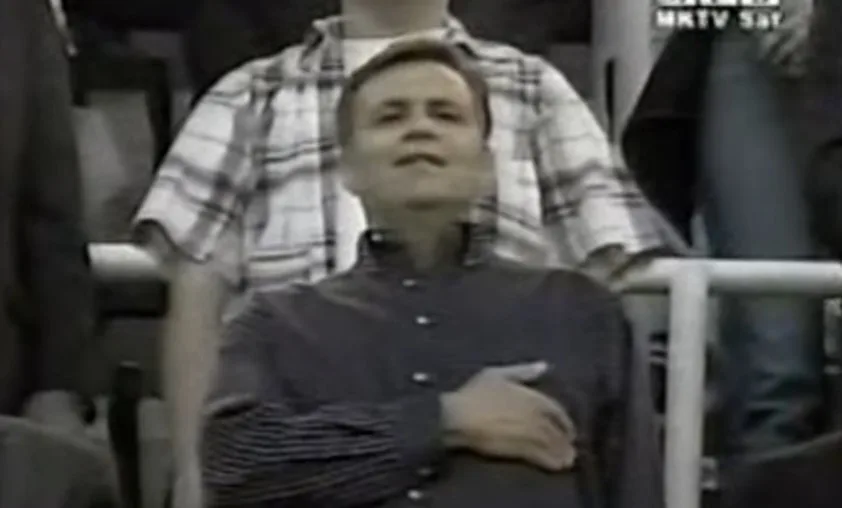 Борис Трајковски и Тоше Проески, политичар и пејач, и двајцата горди Македонци. На преполн стадион навиваат и пејат за Македонија.