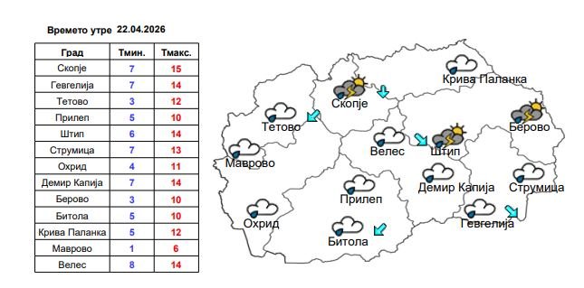 Во Скопје утре ќе биде променливо облачно со врнежи од дожд. Ќе дува слаб до умерен ветер од северен правец. Температурата ќе се движи од 7 до 15 степени Целзиусови.