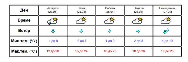 До четврток ќе се задржи променливо облачно и нестабилно време со повремени врнежи од дожд и појава на грмежи. Процесите наместа ќе бидат поинтензивни во форма на невреме со пообилен пороен дожд, грмежи и засилен ветер, особено во западните и јужните делови. Дневната температура ќе биде во опаѓање, а во четврток и петок утринската наместа ќе се спушти и под нулата. Ќе дува северен ветер, кој во четврток ќе биде засилен, повремено силен.