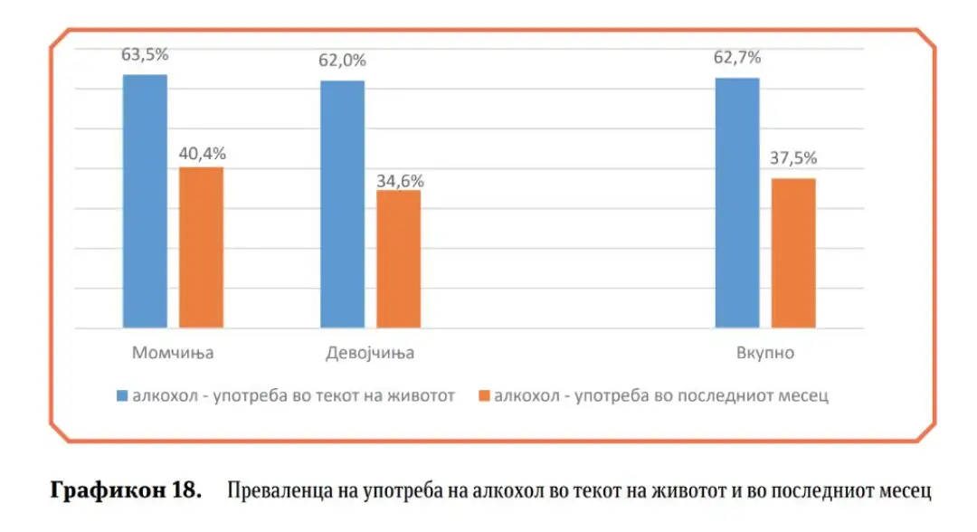 Во истражувањето се посочува дека употребата на алкохол во текот на животот е малку поголема кај момчињата (63,5 проценти) отколку кај девојчињата (62 проценти), што резултира со вкупна преваленца од 62,7 проценти. Употребата на алкохол минатиот месец покажува поизразена разлика во половите, при што 40,4 проценти од момчињата и 34,6 проценти од девојчињата пријавиле употреба, а вкупната преваленца е 37,5 проценти.