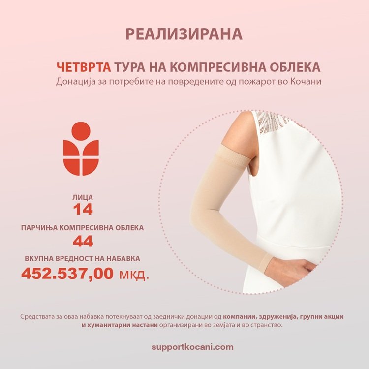 Овој циклус на донации опфаќа 44 парчиња компресивна облека, изработени по индивидуални мерки за 14 пациенти, во вредност од 452.537 денари. Целата сума е собрана преку донации од граѓани, компании и поддржувачи од земјата и странство.