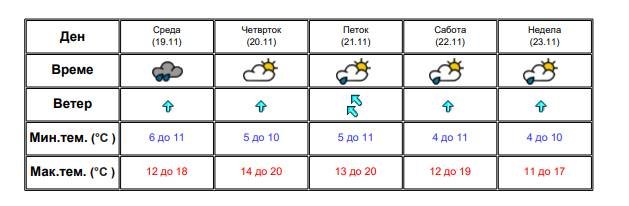 УХМР издаде временско предупредување за следнте денови. Под влијание на серија влажни воздушни бранови до крајот на седмицата следува период на променливо облачно и релативно топло време со повремени локални врнежи од дожд. Наместа врнежите ќе бидат пообилни, локално со услови за невреме со засилен ветер (над 60 километри на час) и со ретки грмежи. Во текот на 24 часа се очекува да наврне поголема количина дожд, над 30 литри на квадрат. Ќе дува умерен до засилен ветер од јужен правец.