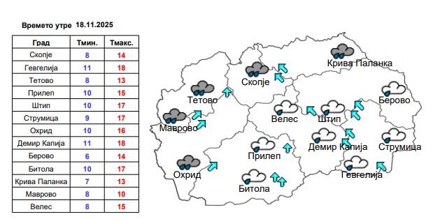 Во Скопје времето утре ќе биде облачно со повремени врнежи од дожд, кои во делови од котлината повремено ќе бидат пообилни. Ќе дува умерен, а во делови од котлината повремено засилен јужен ветер. Температурата ќе се движи од 8 до 14 степени.
