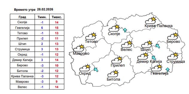 Утрото ќе биде студено, со најниска темпертура од минус 3 степени во Берово, Маврово и во Крива Паланка. Најтопло ќе биде во Гевгелија, со максимална ддневна температура од 15 степени Целзиусови.
