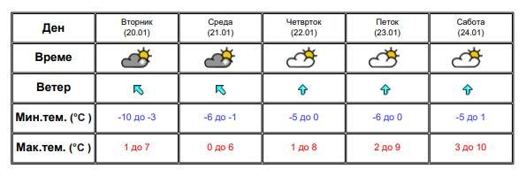 Најстудено ќе биде во Берово и во Маврово, каде температурата ќе се спушти до минус 8 степени. Најтопло ќе биде во Гевгелија, со дневна температура до 6 степени Целзиусови.