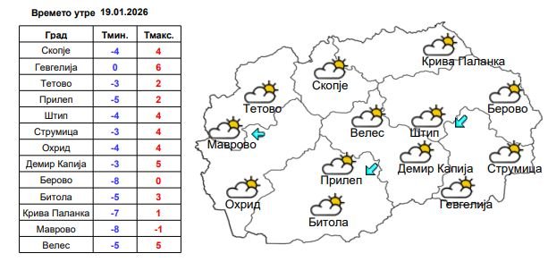 Во Скопје, сончево со умерена облачност. Ќе дува слаб ветер од североисточен правец. Температурата ќе се движи од минус 4 до 4 степени.