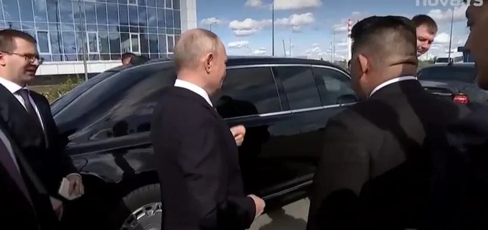 Севернокорејскиот лидер Ким Џонг-ун седна за прв пат во автомобил што му го подари рускиот претседател Владимир Путин во февруари,