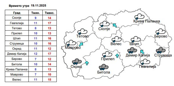 Ввремето утре ќе биде претежно облачно со повремени локални врнежи од дожд, особено претпладне во југозападните и во јужните делови. Ќе дува слаб до умерен ветер од јужен правец.