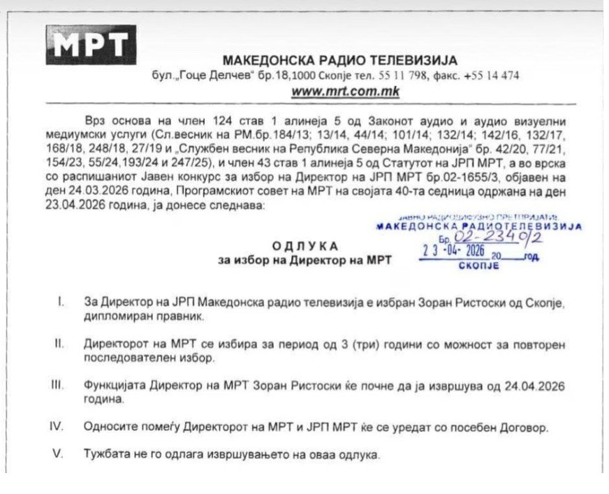 ЗОРАН РИСТОСКИ Е НОВИОТ ПРВ ЧОВЕК НА ЈАВНИОТ СЕРВИС Советот на МРТ очекува од новиот директор 3 приоритети во работата